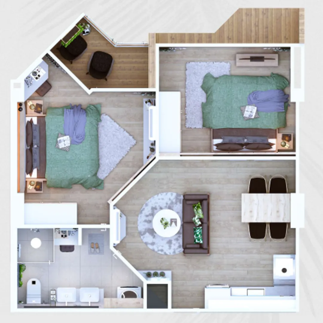 Квартира полностью меблирована и готова к проживанию: оборудованная кухня, обеденная зона, места для отдыха и хранения продуманы без лишних компромиссов. Площадь 60.3 м² делает формат удобным как для жизни, так и для аренды более высокого класса. Угловое расположение добавляет воздуха и уединения, что особенно ценят арендаторы, выбирающие не просто апартаменты, а комфортное пространство для длительного пребывания.