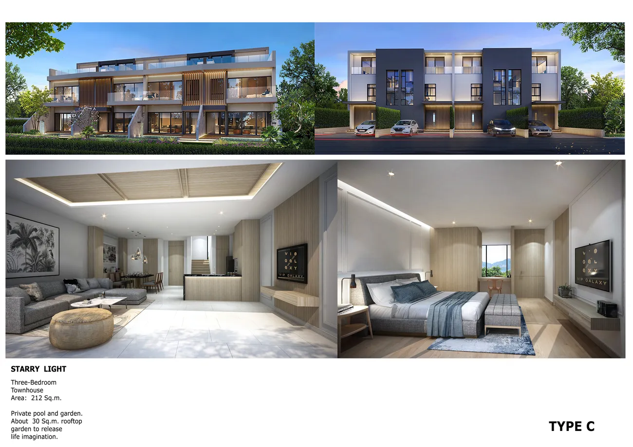 VIP Galaxy Villas — 114 резиденций на южной окраине Пхукета, где застройщик VIP Thailand Development впервые собирает villа-кластер такого масштаба, не жертвуя приватностью . Три типа домов — от 206 до 272 квадратов — с собственными бассейнами и садами, а названия вроде Sea‘s Whisper и Dance with the Wind здесь не маркетинговые ярлыки, а архитектурная заявка: трёхэтажные объёмы, где первый этаж растворён в террасе у воды, а спальни подняты выше садов . Это не просто виллы, а попытка собрать посёлок, где минимализм стекла и бетона смягчён тропической зеленью и пятизвёздочным отелем в 5000 метров — с рестораном, спа и лаунджем, который становится гостиной для всего комплекса .