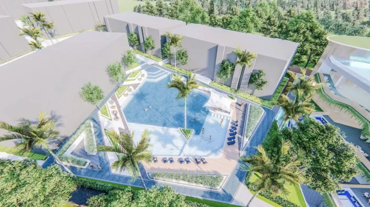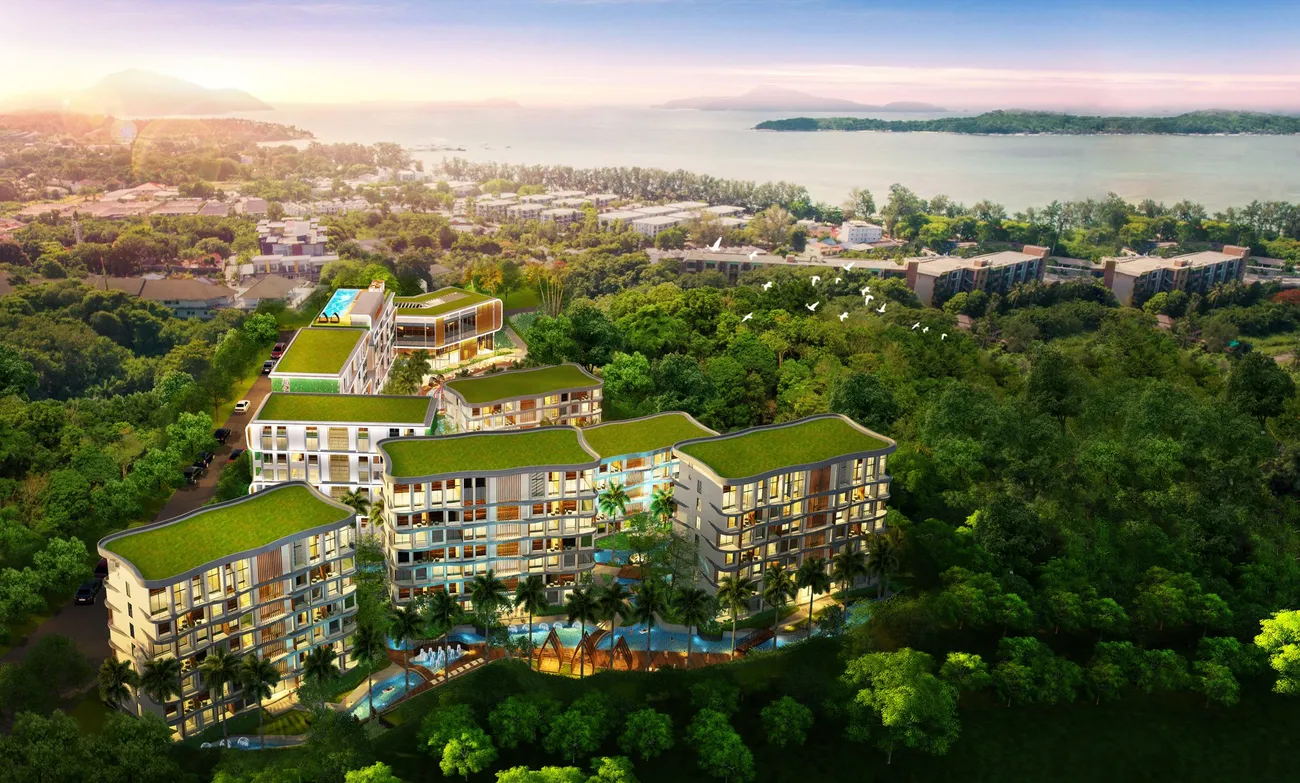 Wyndham La Vita Phuket — 516 резиденций, рассредоточенных по семи корпусам на холме Раваи, где главным архитектурным жестом стал не фасад, а вода. Бассейны здесь не просто аксессуар, а organising principle: центральный выполнен в форме лагуны с каскадами и водопадами, создавая иллюзию, что корпуса вырастают прямо из тропического водоёма . К нему добавляются панорамный бассейн на крыше лобби с видом на Андаманское море и закаты над островами, а также водный городок для детей — инфраструктура, собранная так, что на территории можно не вспоминать о пляже днями . Управление Wyndham, завершившее проект в 2022-м, превращает квадратные метры в гостиничный актив с пятизвёздочным сервисом, спа Cheeva, ресторанами и трансферами до ближайших бухт .